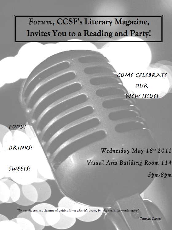 Today, Wednesday May 18 @ 5pm: all are invited to celebrate the launch of the Spring 2011 issue of Forum. Crash the party at the Visual Arts Building Room 114. Food, drinks, sweets, and literary treats!