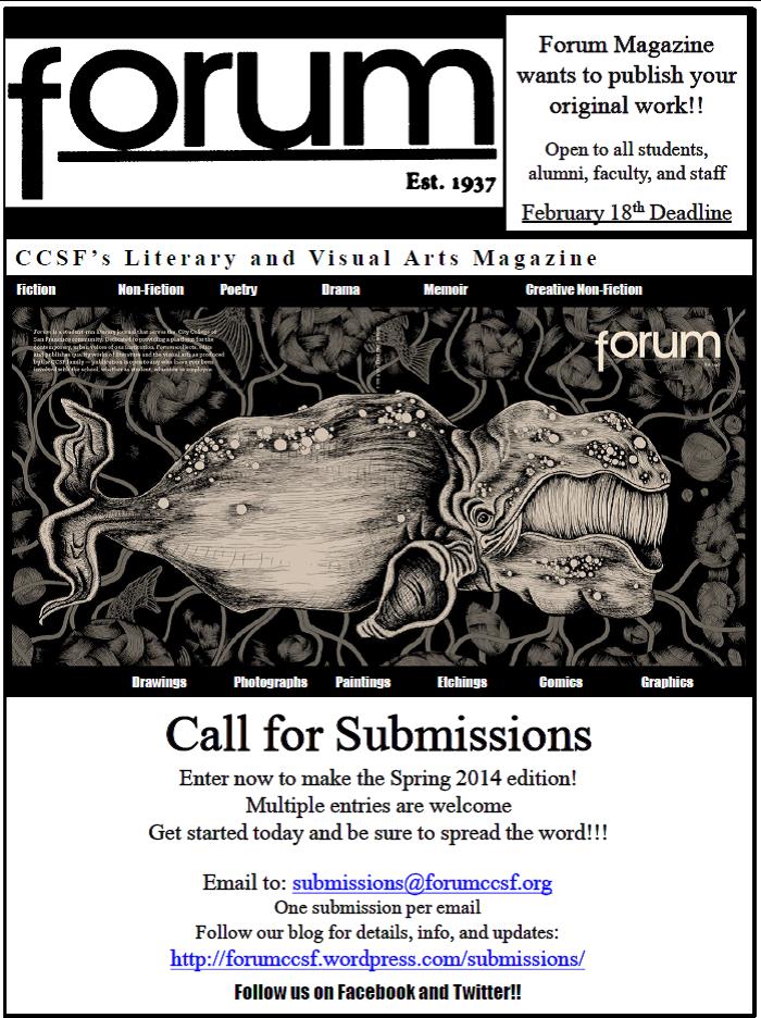 Submit your fiction, non-fiction, poetry, drama, photography, art and comics to submissions@forumccsf.org by February 18th for your chance to be published!