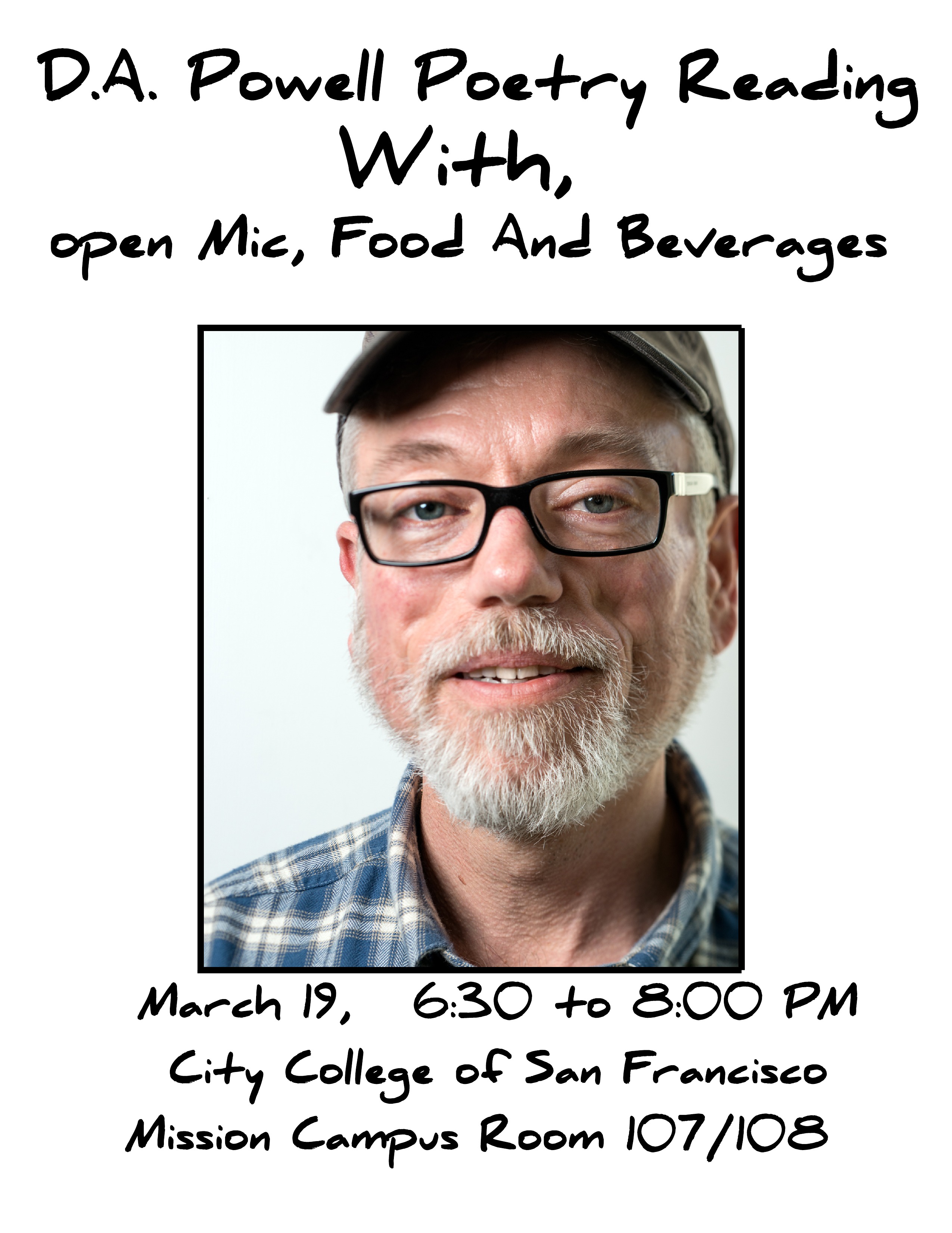 Please join Forum and City College’s Creative Writing department for a night of Poetry with D.A. Powell. The reading will be held at The Mission Campus(22nd and Valencia) Room 107/108. The reading will be followed by an Open Mic with beverages and food.