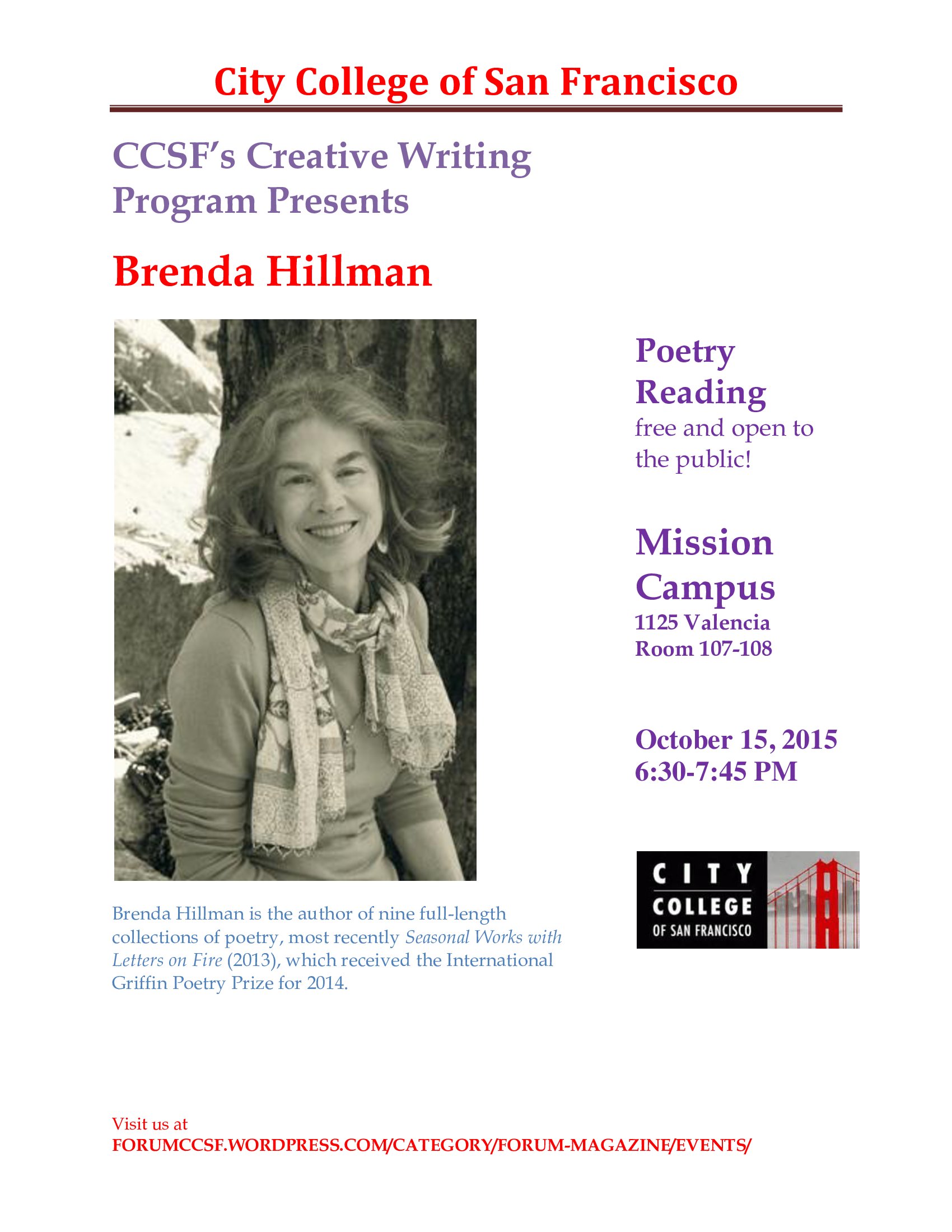 Brenda Hillman reads at CCSF Mission campus on 10/15/15!