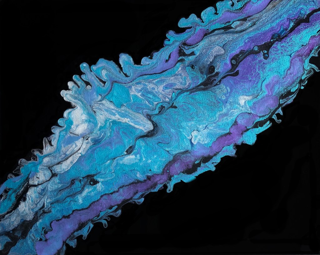 This piece, titled “Lost in the Cosmos,” is inspired by space. There is something so dark and mysterious but also beautiful about the depths of the universe, which is what I hope to convey through this piece.