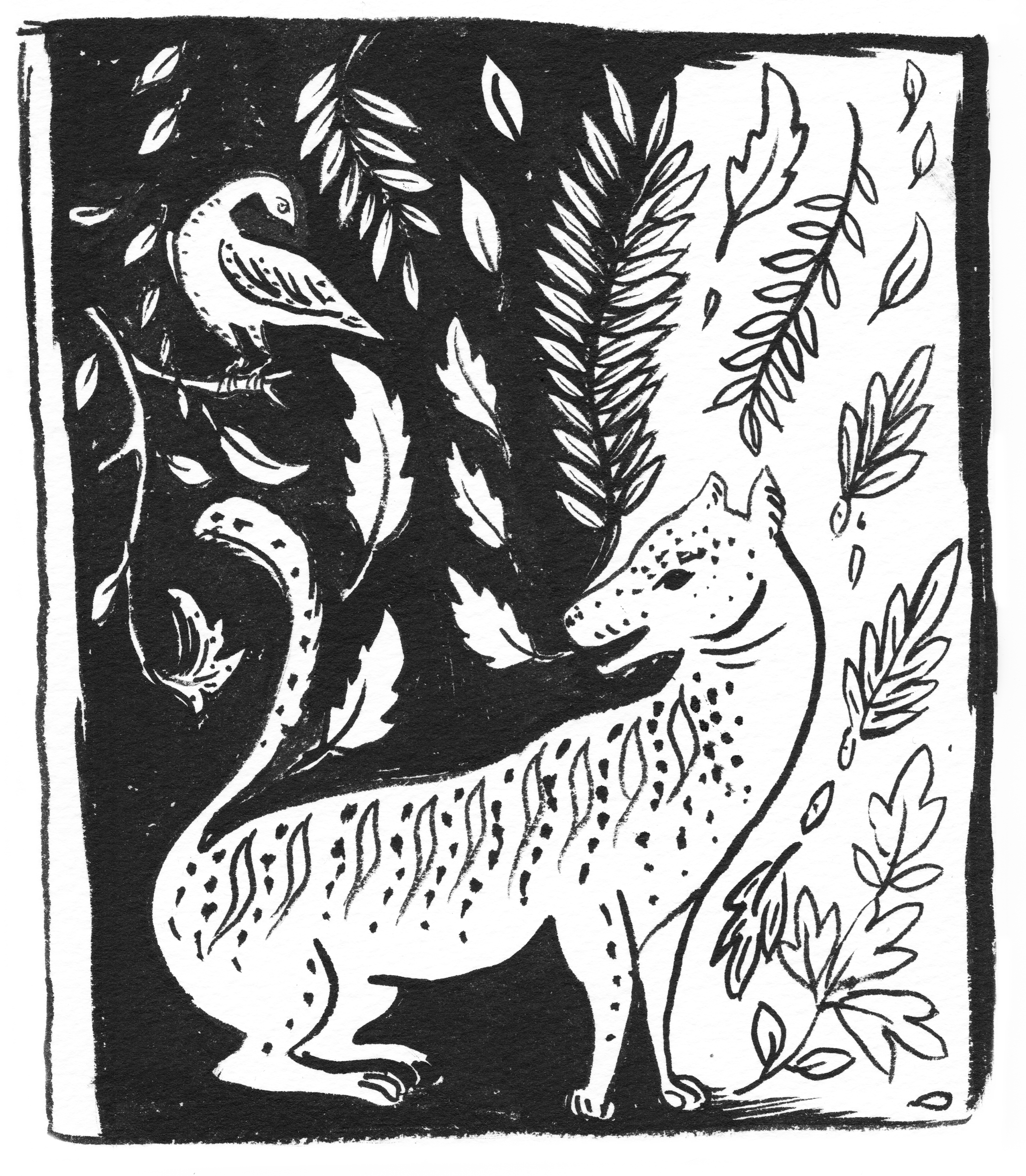 Sarah A. Smith works with ink on paper to create scenes that feature animals and nature. Often, her inspiration comes from antiques and objects in museums like this one, “Tiger and Hen,” drawn from a design on a 17th century huqqa base which is in the collection of the Asian Art Museum of San Francisco.