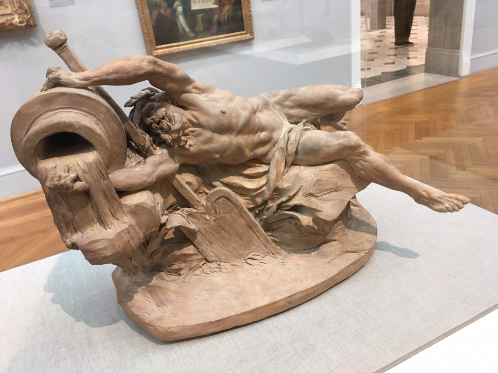 Not far from Jeune femme, somewhat obscured by a reflective plexiglass case, is a terracotta figure, only 12″ by 18″, by 27-year-old (Claude Michel) Clodion (1738-1814): The River Rhine Separating the Waters (1765). The two works have much in common. As an idealized avatar of gender, Rhine is as manly and muscled as Jeune femme is doll-like and pert-breasted. The less intimate Rhine is caught in a similar moment of physical exertion: his waters alone can divide the territories of the West-bank Gauls from the East-bank Germans.[4] Arms fully extended over a head thrown back with mouth agape, his hands gripping the cosmic water urn, he lies on his side on the rough rocks of the riverbank, stretching out his lean torso, the crux of his rippling thighs hidden by a river plant’s long clinging leaves. Shifted to a vertical position, Rhine’s urn would look not unlike Jeune femme’s pillow—except he hangs on as it gushes willy-nilly, while she must throw hers. Both figures are heroic: active, decisive, in control of a volatile situation—incarnating the energy and urgency of their virtuoso creators.