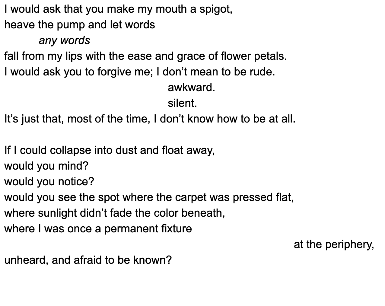 I received my English degree with a Spanish minor from CSU Stanislaus in Spring 2019, and I will complete my creative writing certificate at CCSF in Spring 2020. Writing is my passion, but I also dabble in drawing, painting, photography, and performance. My work has appeared in Penumbra Literary Magazine.