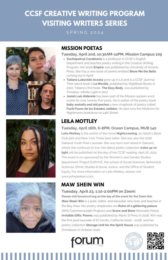CCSF’s Visiting Writers program brings exciting voices from the Bay Area and beyond to CCSF. Check upcoming author visits below and mark your calendar.