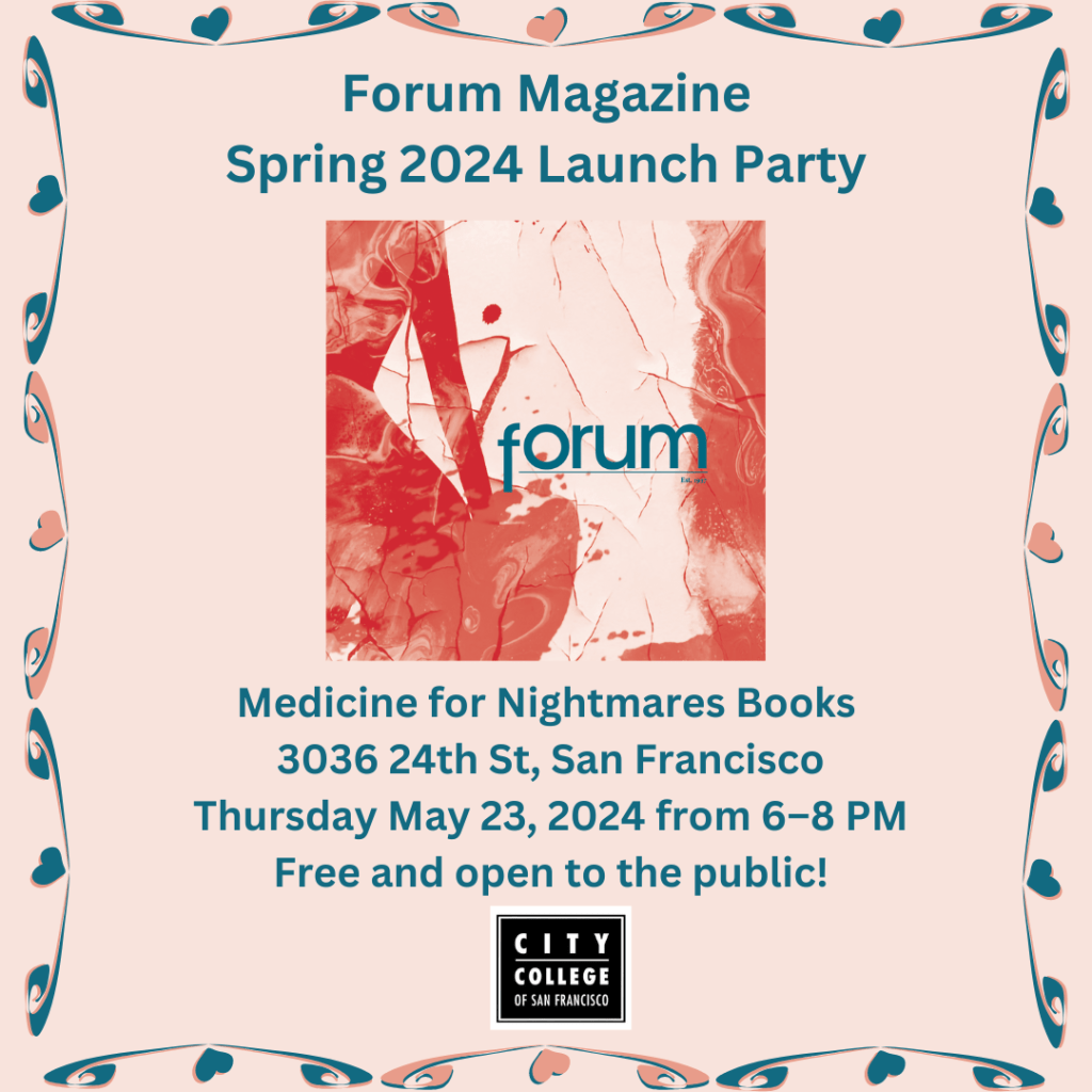 The launch party for the Spring 2024 edition of Forum, CCSF’s literary magazine, will be on Thursday, May 23, from 6 to 8pm at Medicine for Nightmares Books in the Mission District (3036 24th Street).