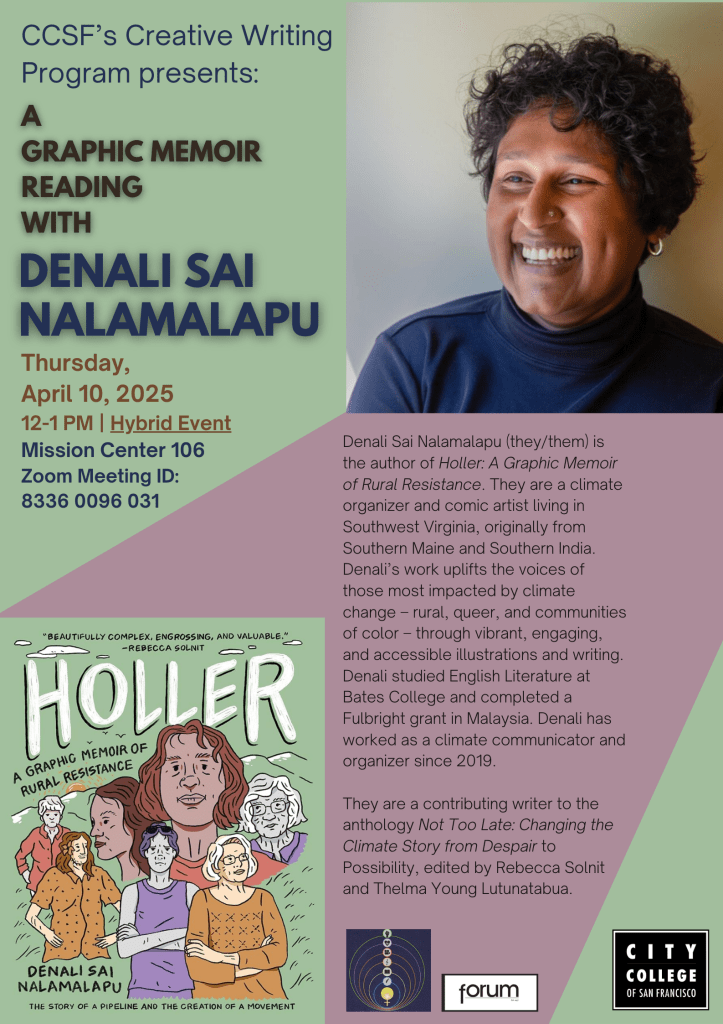 Please join us for the seventh reading in our spring Visiting Writers Series! Professor Maggie Harrison will host a reading and discussion with writer and graphic memoirist Denali Sai Nalamalapu! They are a contributing writer to the anthology Not Too Late: Changing the Climate Story from Despair to Possibility, edited by Rebecca Solnit and Thelma Young Lutunatabua.