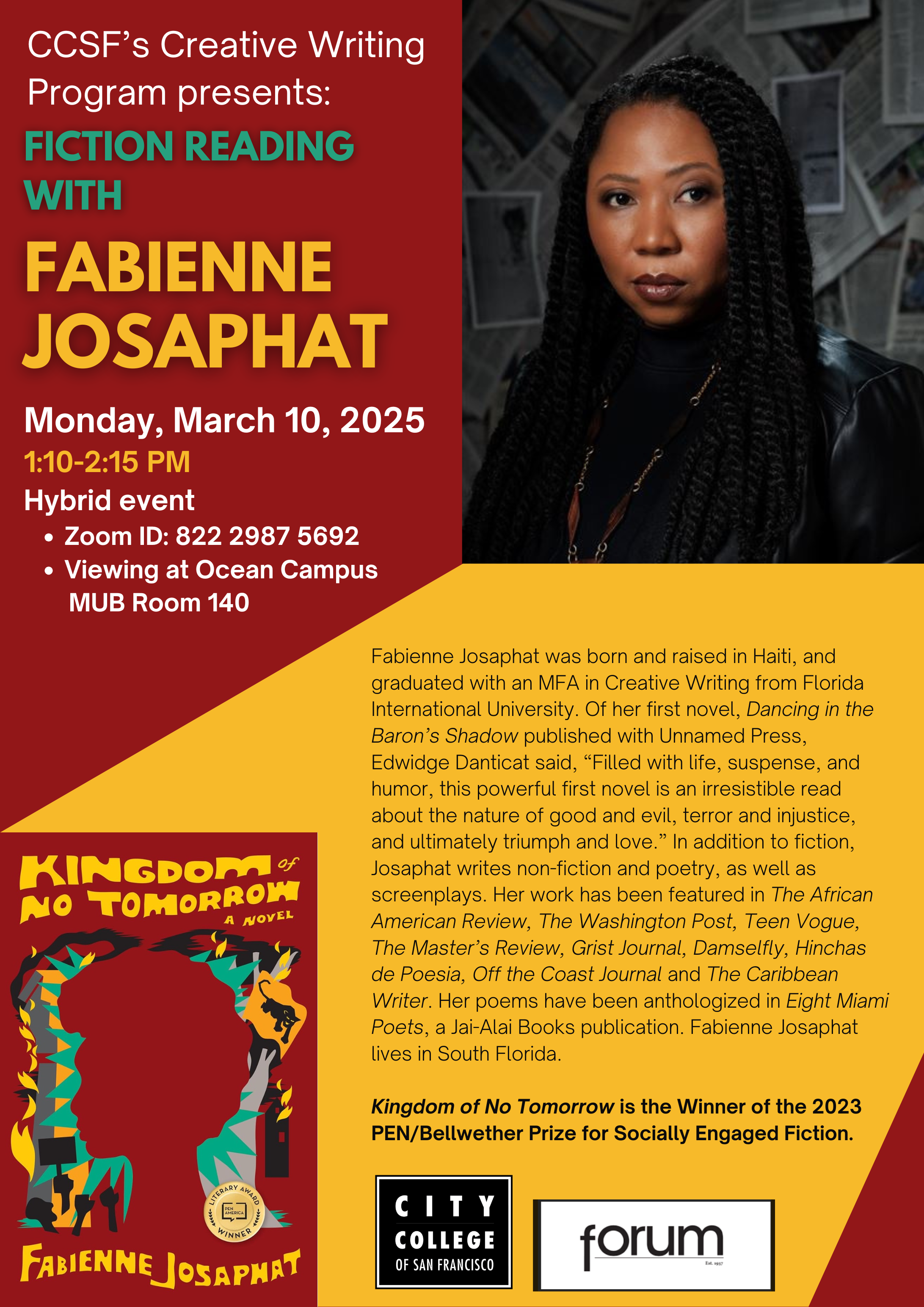 Join us for our second reading in our spring Visiting Writers Series! Professor Maggie Harrison will host novelist, poet, and screenplay writer Fabienne Josaphat for a hybrid reading!