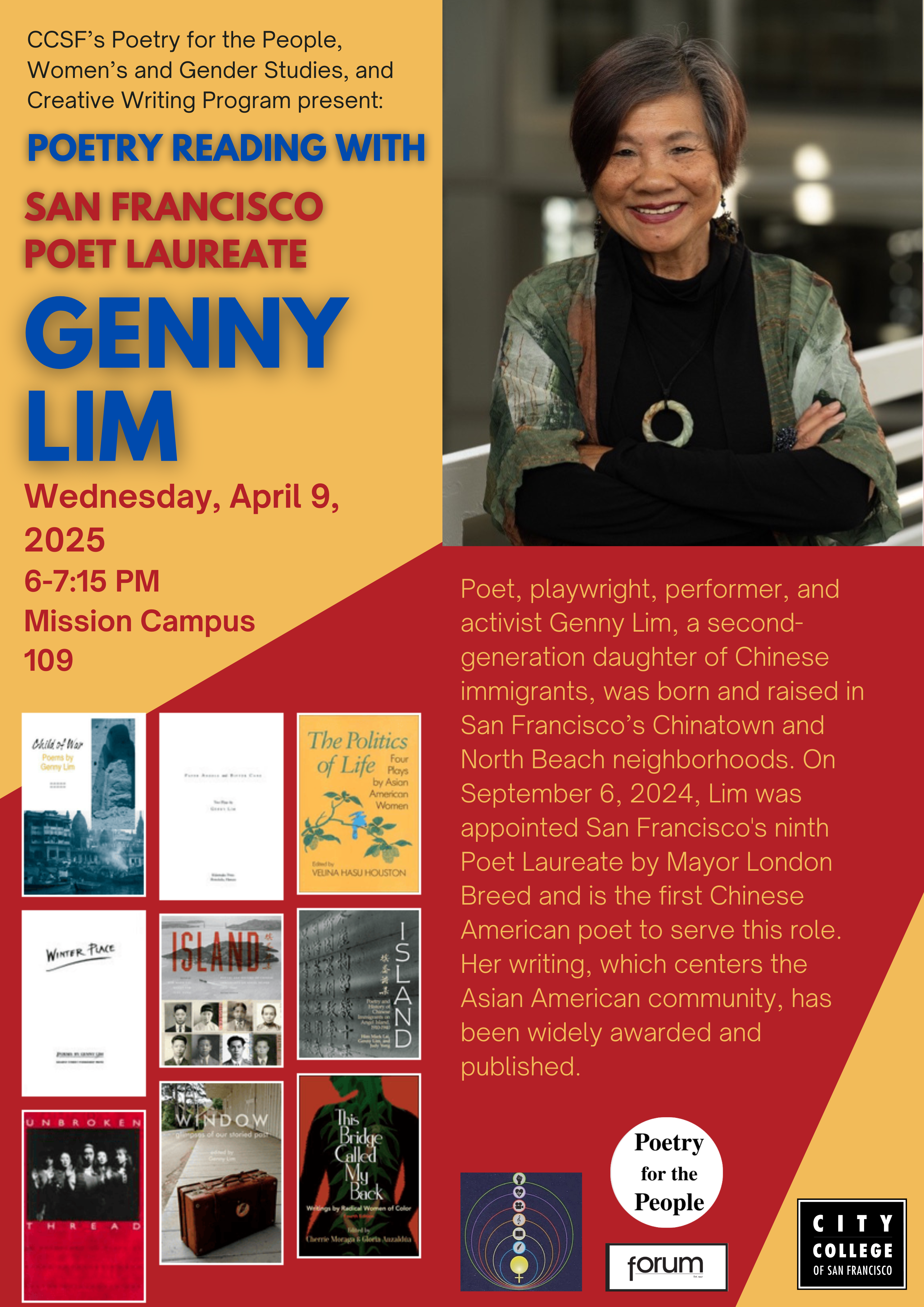 Poet, playwright, performer, and activist Genny Lim, a second-generation daughter of Chinese immigrants, was born and raised in San Francisco’s Chinatown and North Beach neighborhoods. On September 6, 2024, Lim was appointed San Francisco’s ninth Poet Laureate by Mayor London Breed and is the first Chinese American poet to serve this role. Her writing, which centers the Asian American community, has been widely awarded and published.