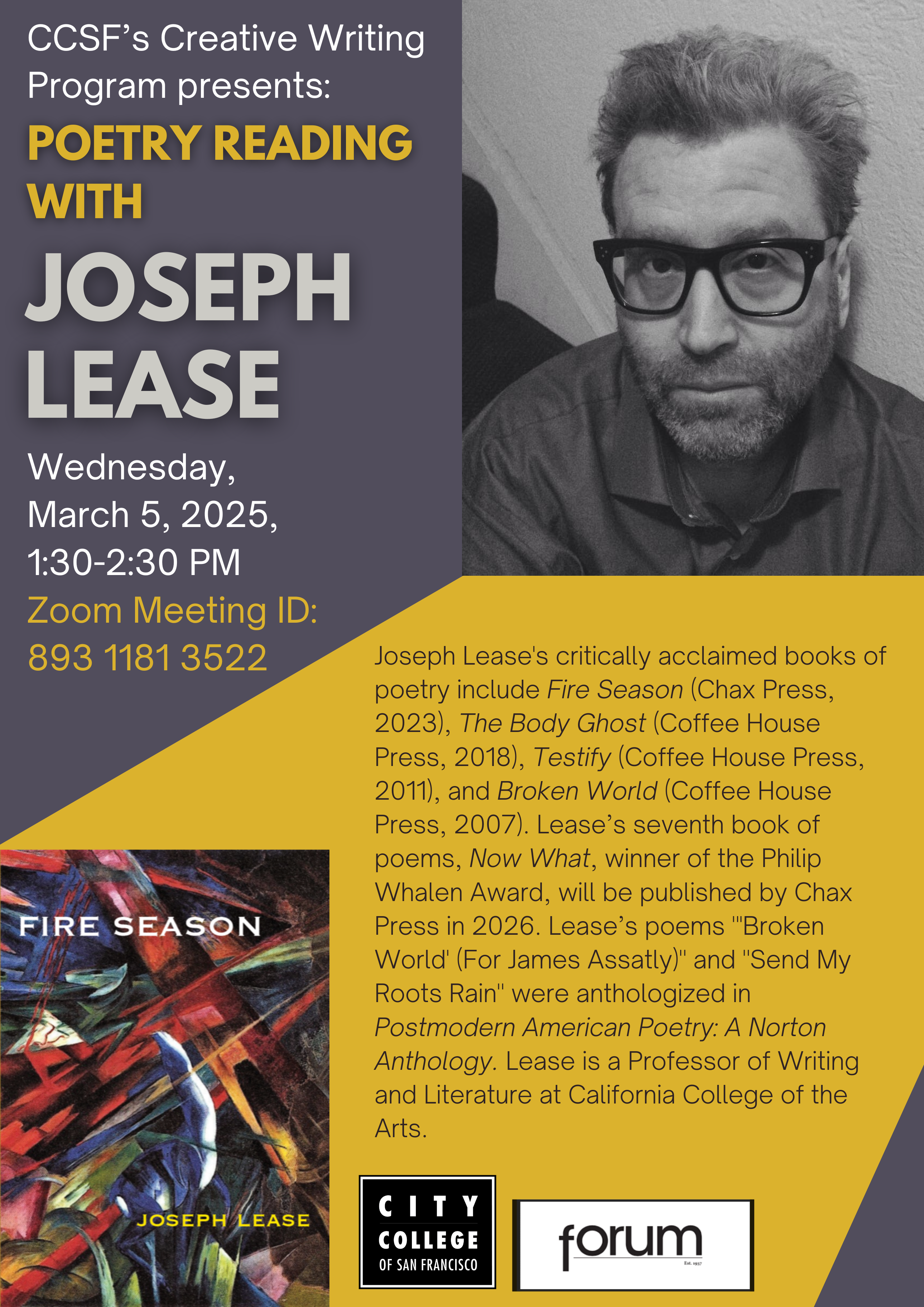 Joseph Lease’s critically acclaimed books of poetry include Fire Season (Chax Press, 2023), The Body Ghost (Coffee House Press, 2018), Testify (Coffee House Press, 2011), and Broken World (Coffee House Press, 2007). Lease’s seventh book of poems, Now What, winner of the Philip Whalen Award, will be published by Chax Press in 2026. Lease’s poems “‘Broken World’ (For James Assatly)” and “Send My Roots Rain” were anthologized in Postmodern American Poetry: A Norton Anthology. Lease is a Professor of Writing and Literature at California College of the Arts.