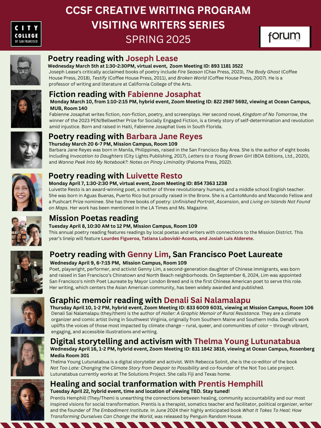 Please join us for our sixth reading in our spring Visiting Writers Series! CCSF’s Poetry for the People, Women’s and Gender Studies, and Creative Writing Program present: